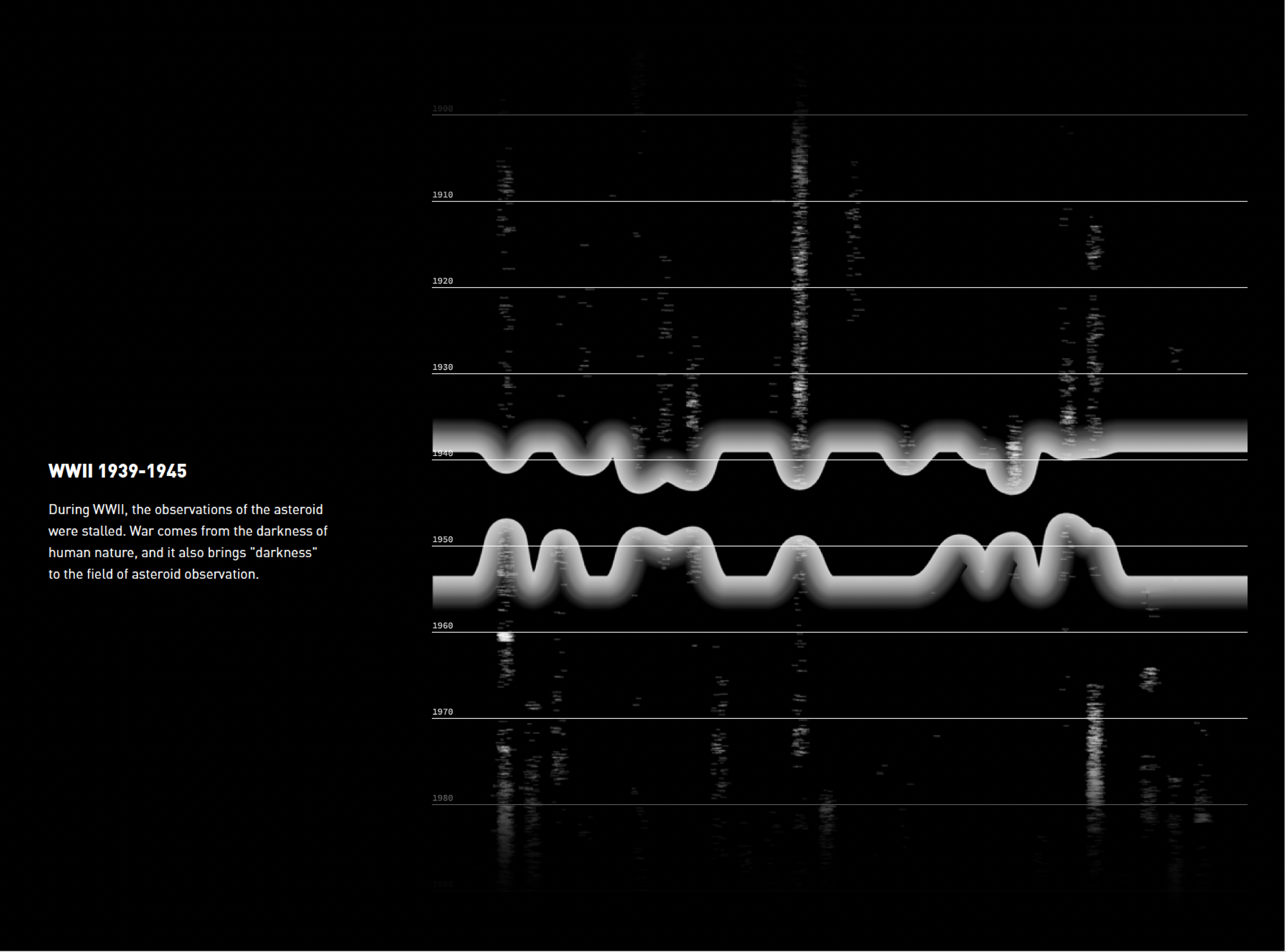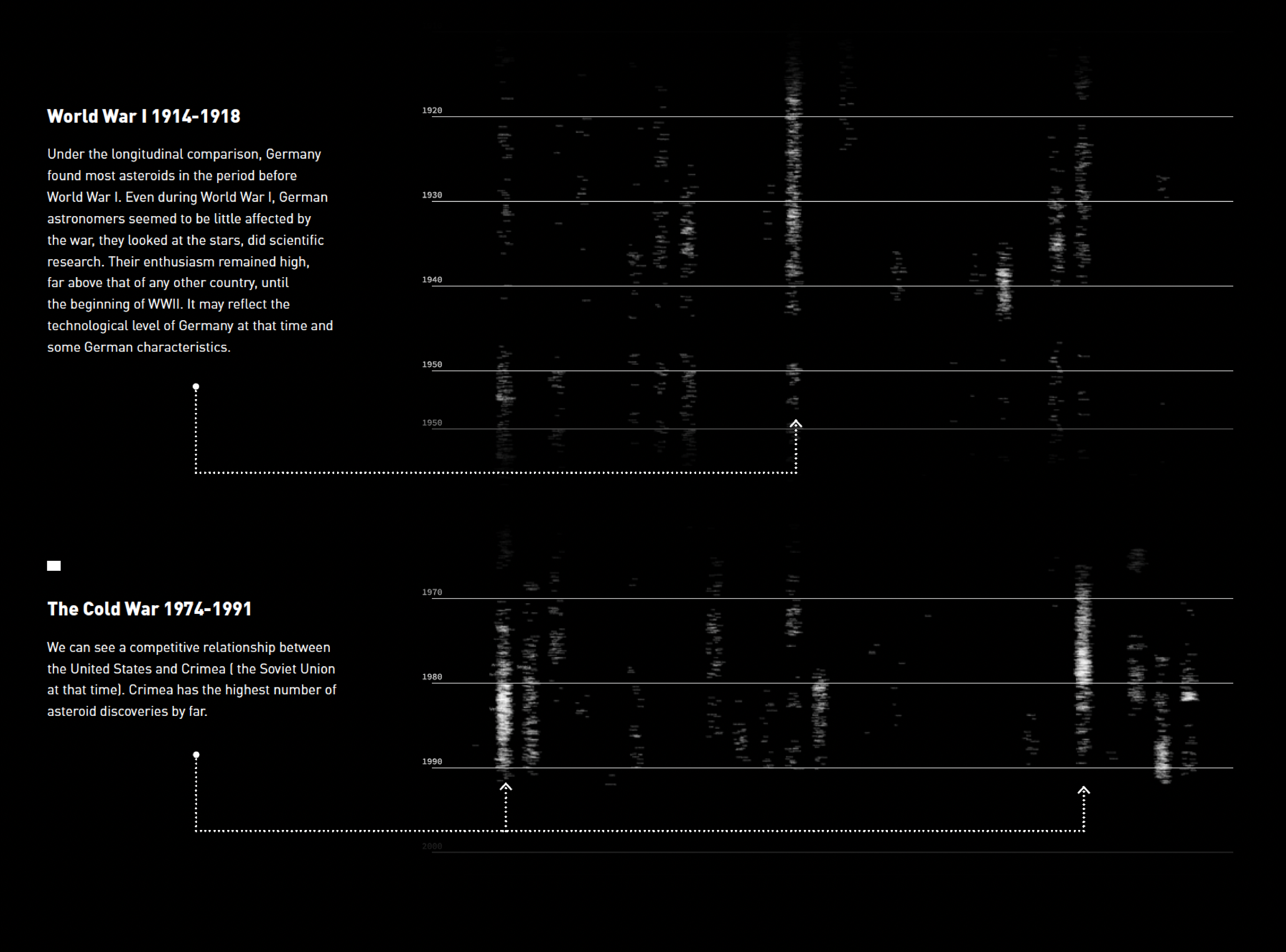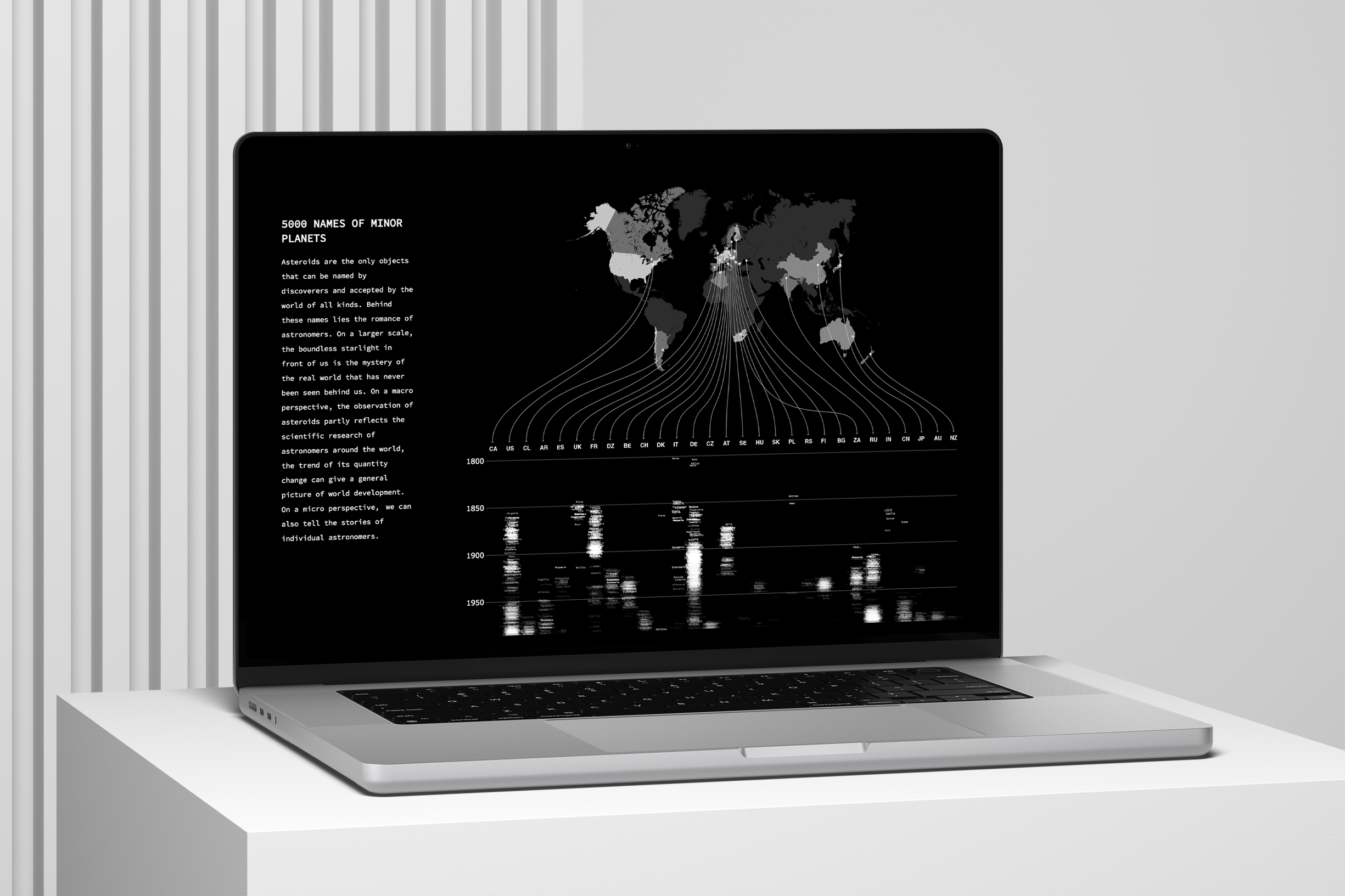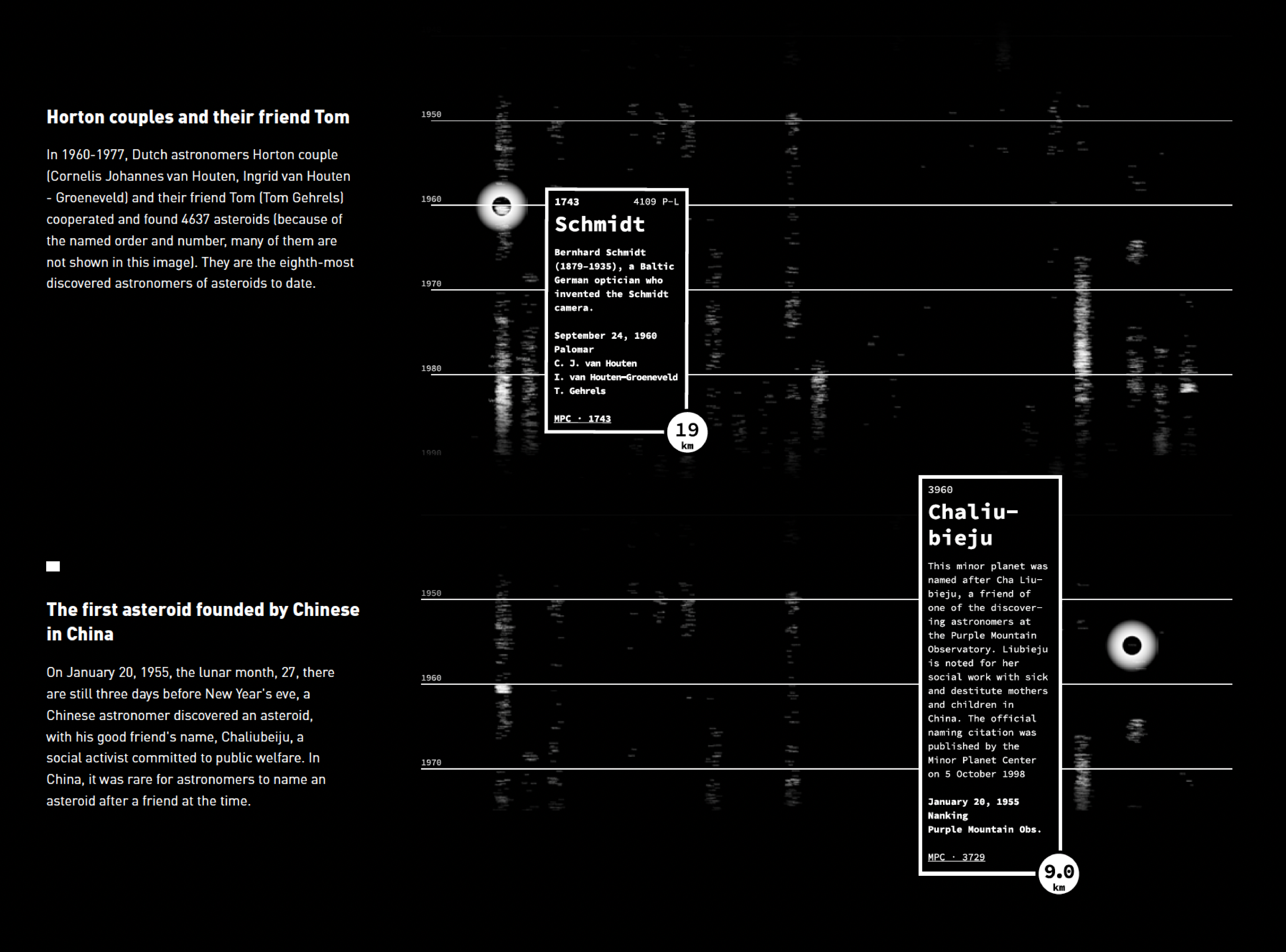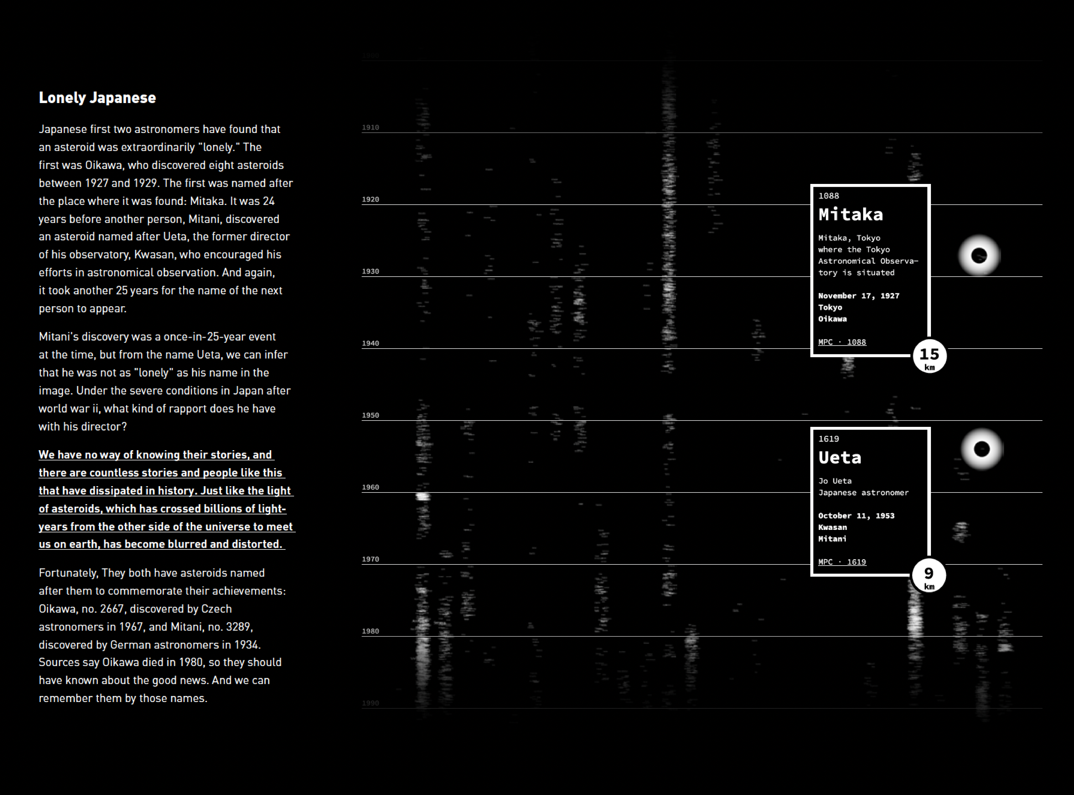 This is a data storytelling website project produced by D3.js, p5.js, and Illustrator, presenting the data information of asteroids No. 1-5000. Data from the MPC (Minor Planet Center).
